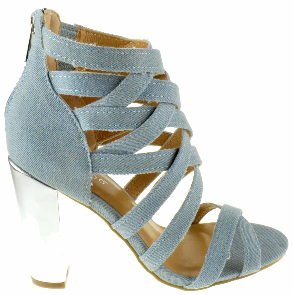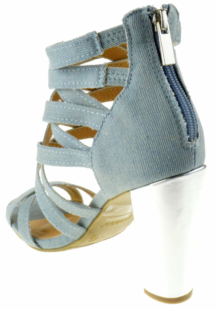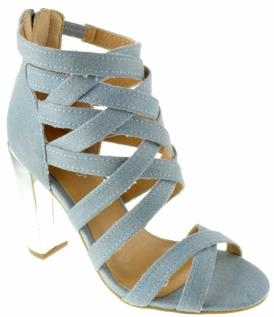 Trendy Denim jean heeled sandal with a zipper closed ankle.