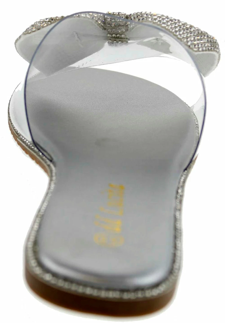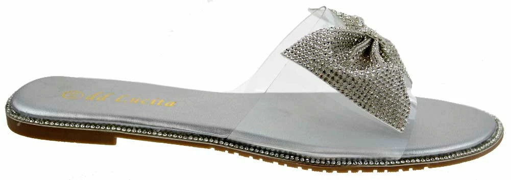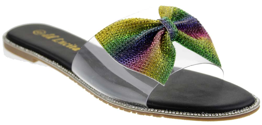 These cuties are the perfect slip on sandals to add a little fun to any outfit with these rhinestone embellished bow! Shine on ladies!