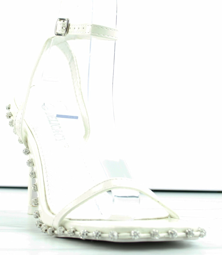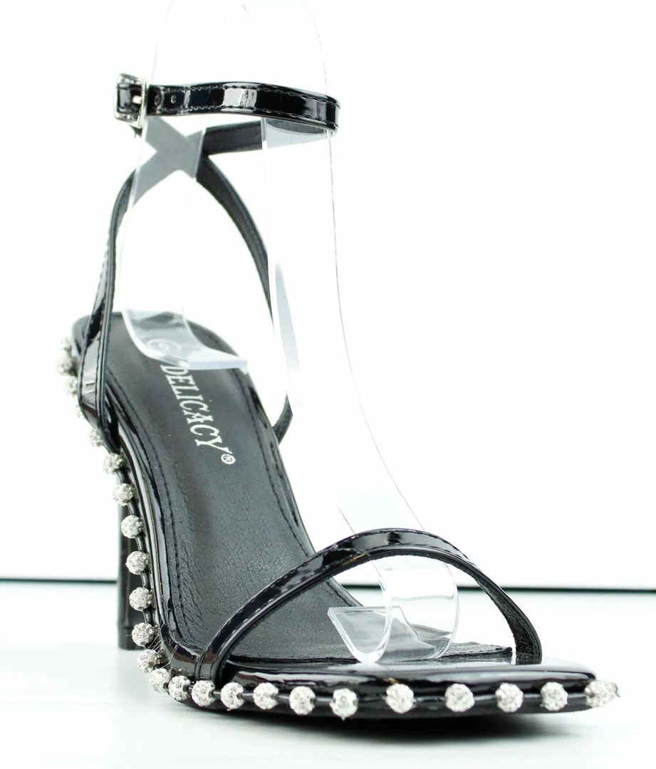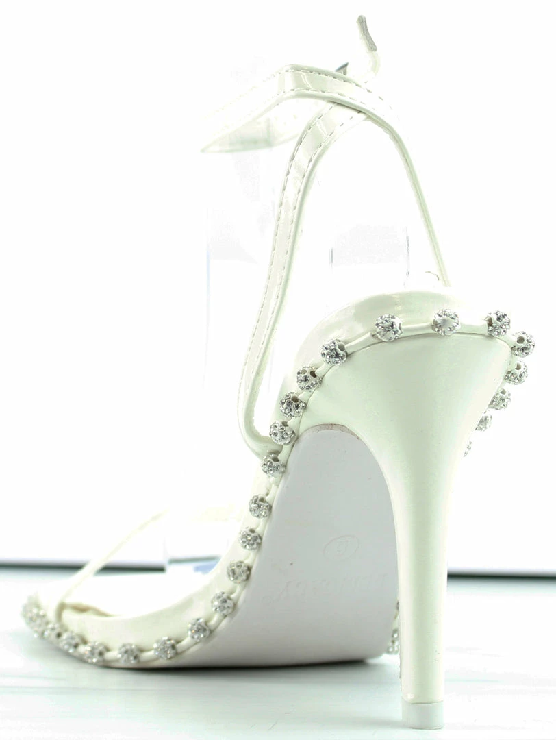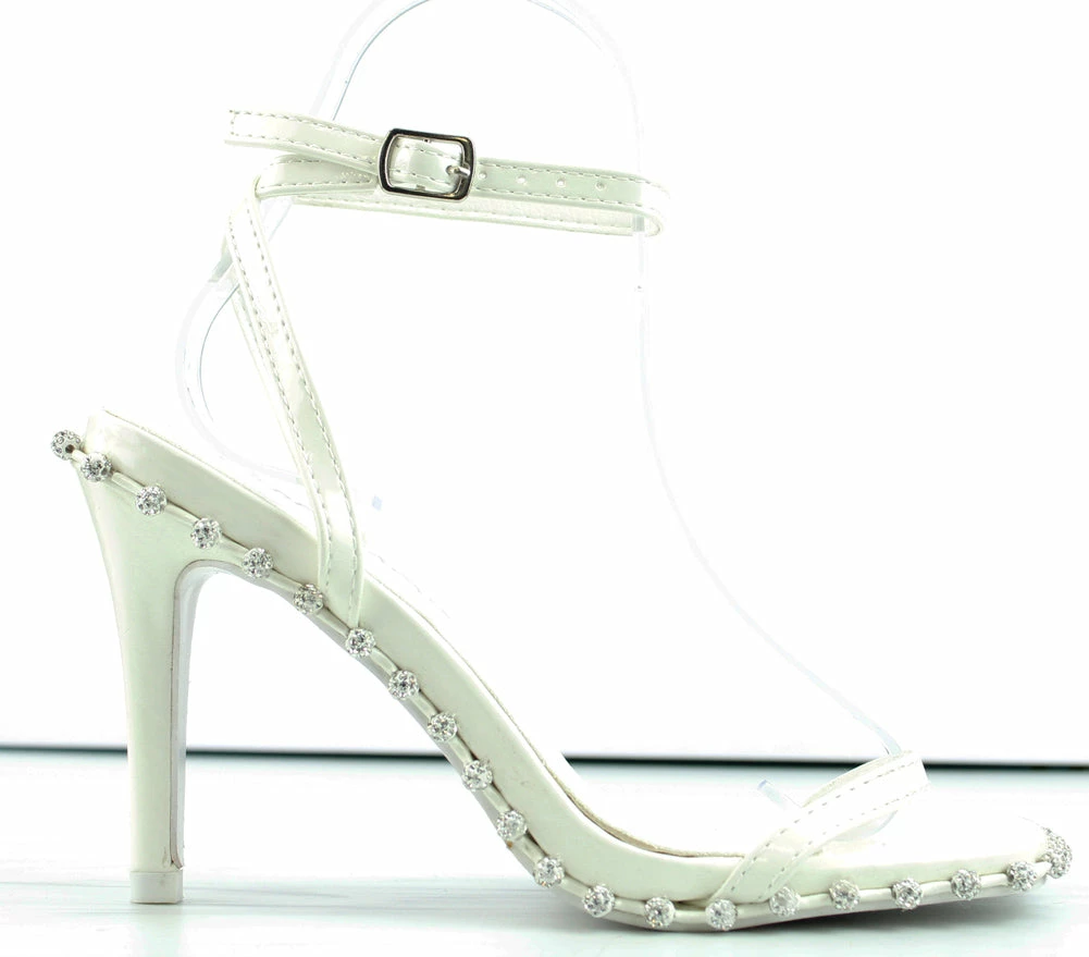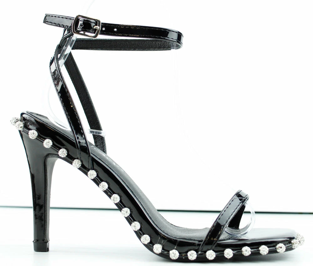 These heeled stiletto sandals with a wrap around rhinestone design and a crossing ankle straps will spruce up any outfit.