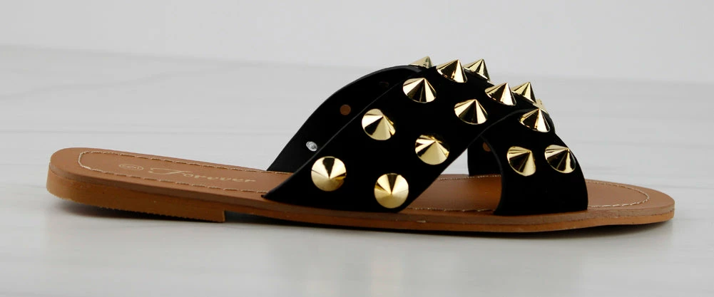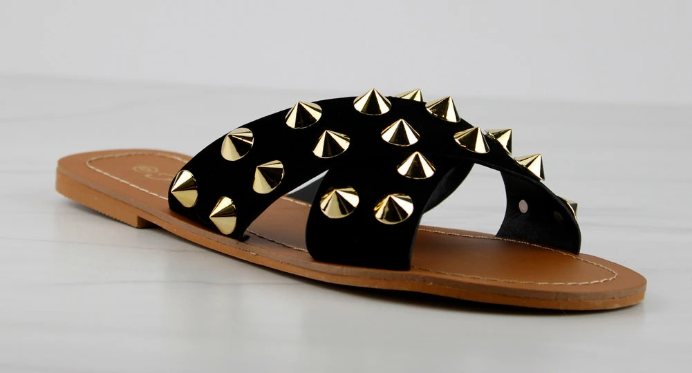 A casual sandal with a little bit of spice! Dorit 68 is a flat slip on sandal that has a crisscross band with spike embellishment!
