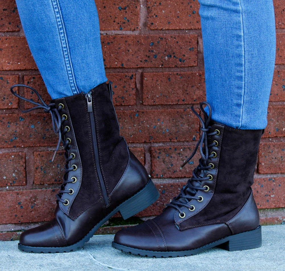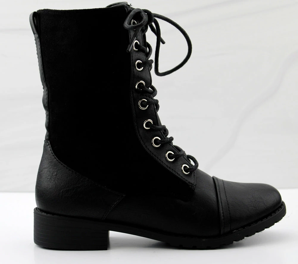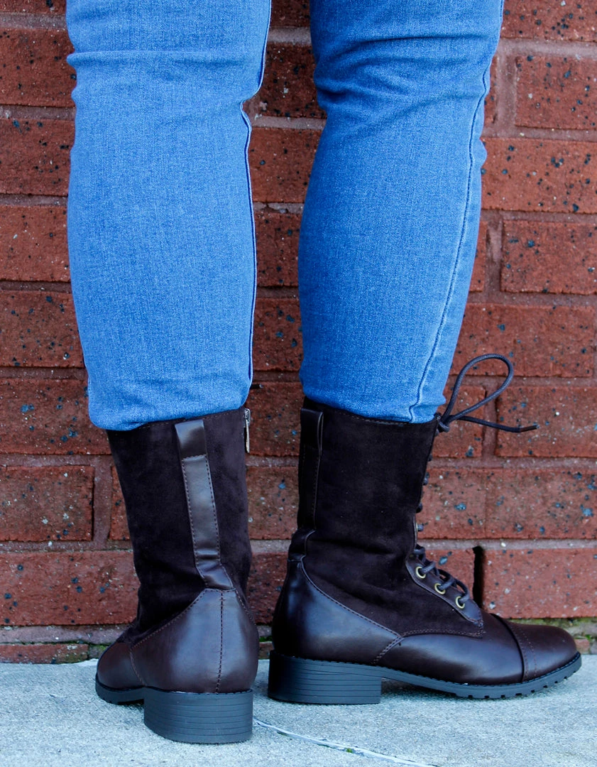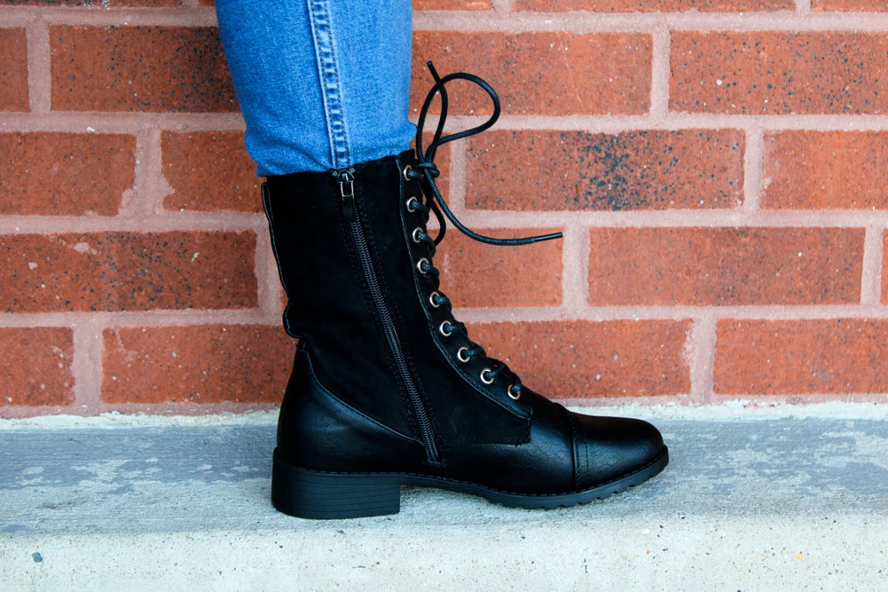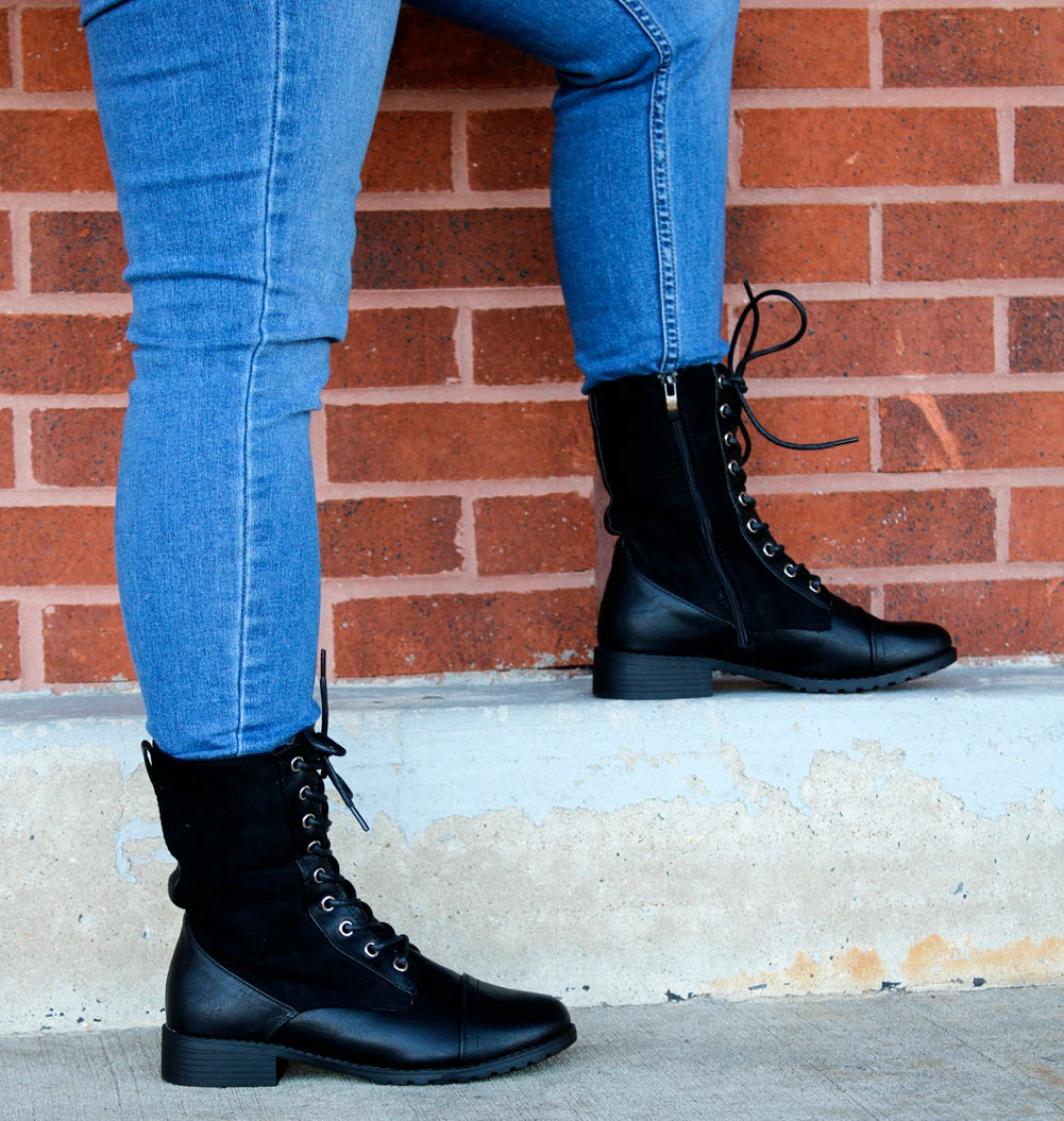 Want cute boots but are on the spunkier side of style? Jalen 33 is just right! These two toned combat boots have a faux leather surrounding with a faux suede material on the sides. They lace all the way up and have a small heel on them! They add just the right amount of spunk to any outfit!
