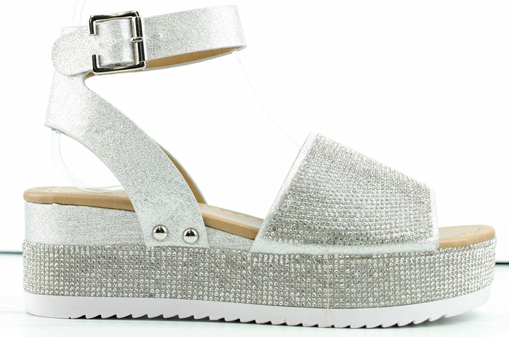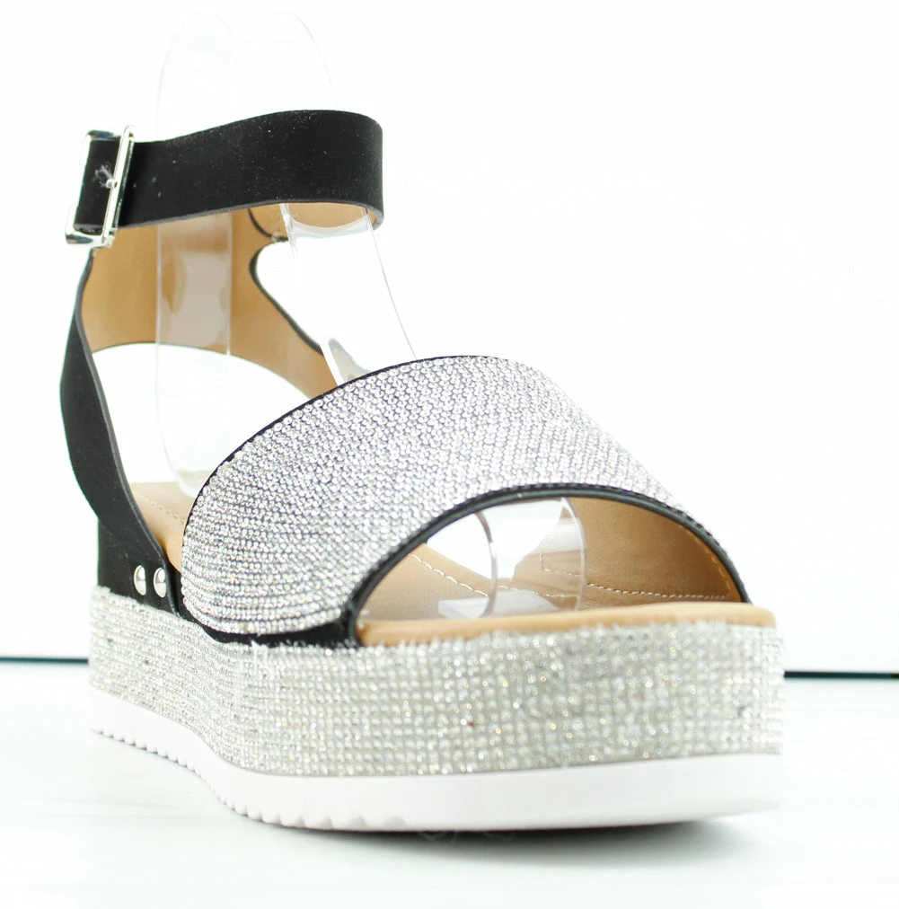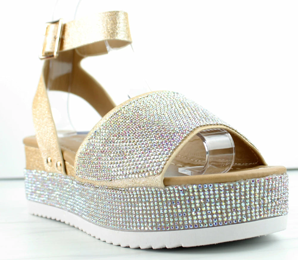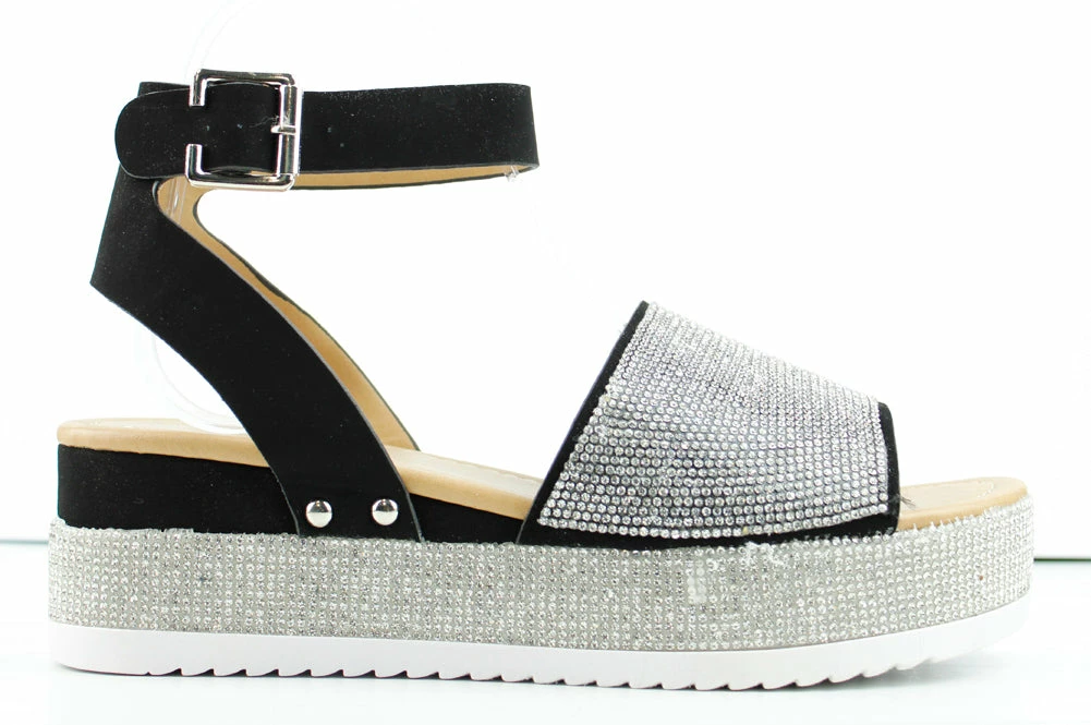 These rhinestone covered platform sandals with an adjustable strap makes these the perfect going out shoes, if you’re looking to be fashionable and comfortable these are the shoes for you!