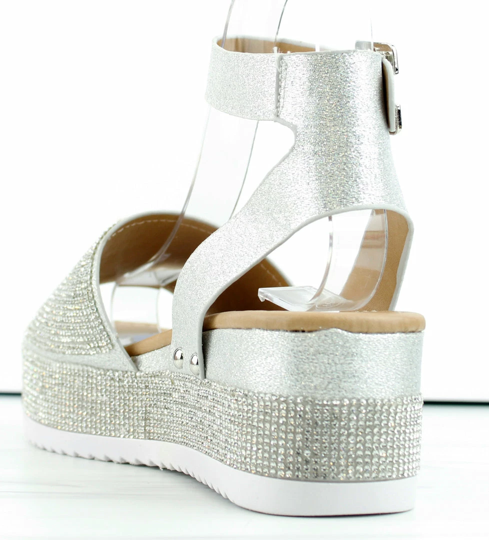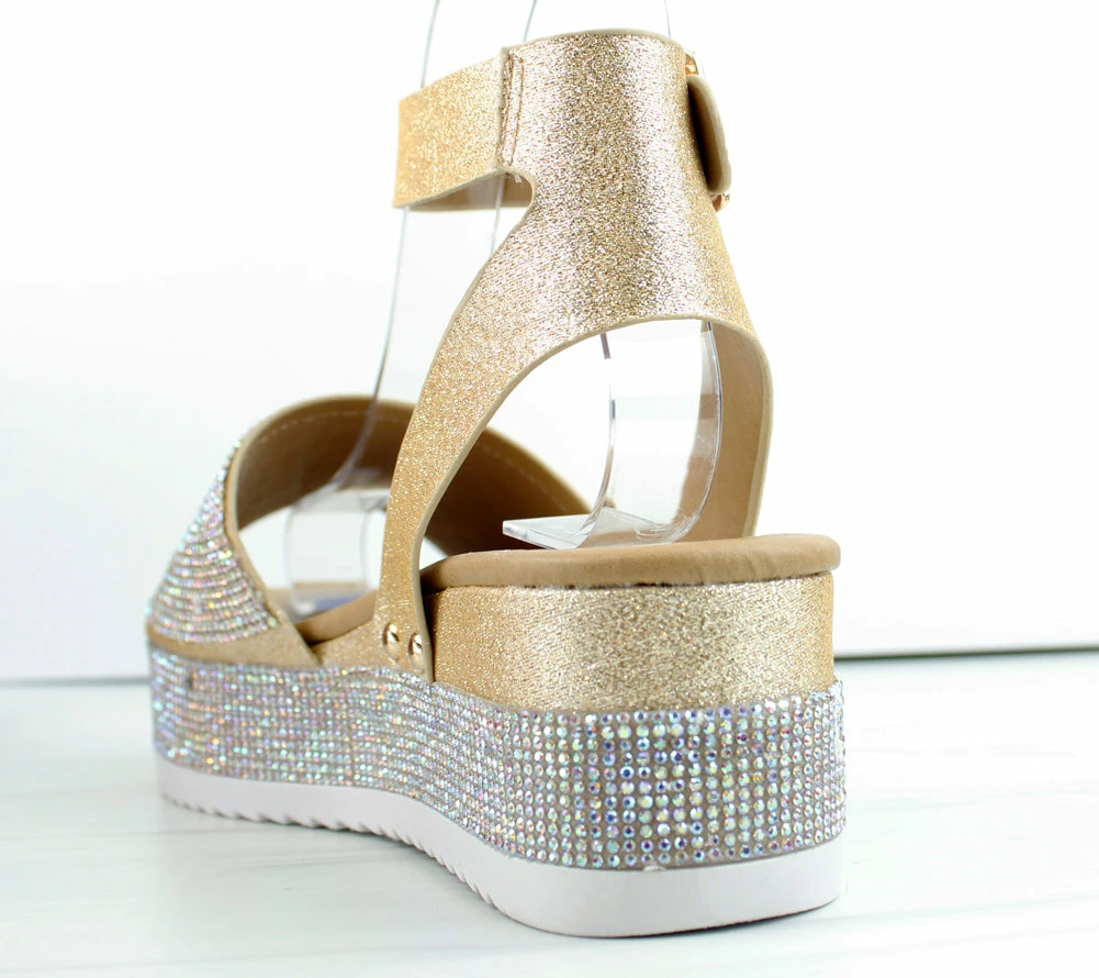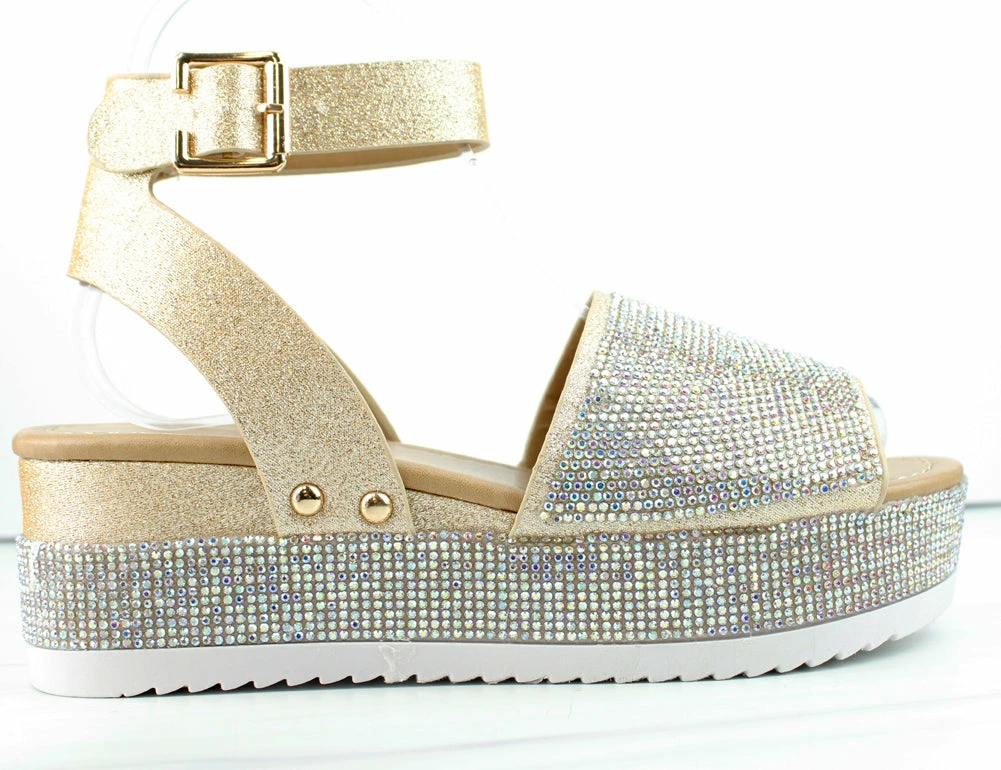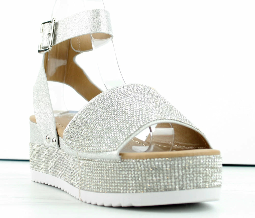 These rhinestone covered platform sandals with an adjustable strap makes these the perfect going out shoes, if you’re looking to be fashionable and comfortable these are the shoes for you!