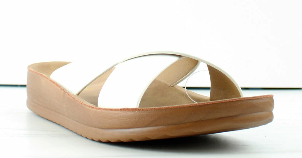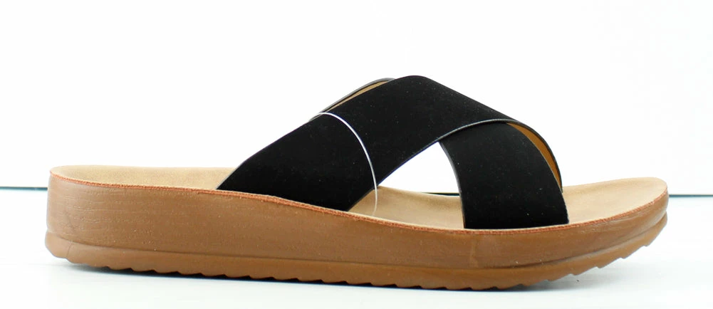 Womens wide cross band Slip on sandal. Padded for comfort.