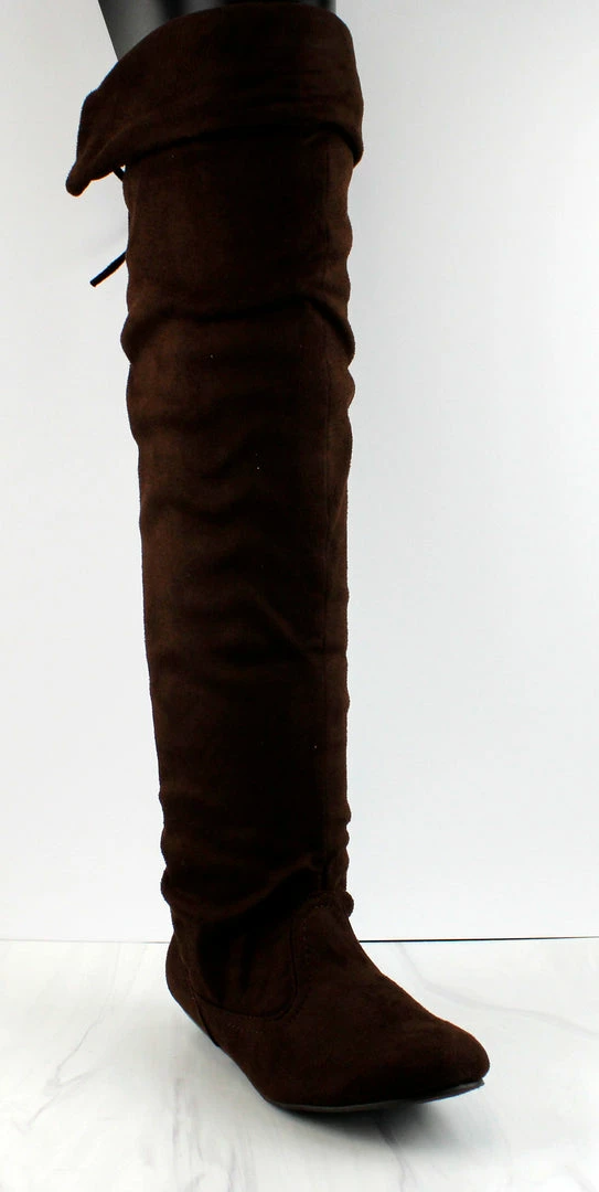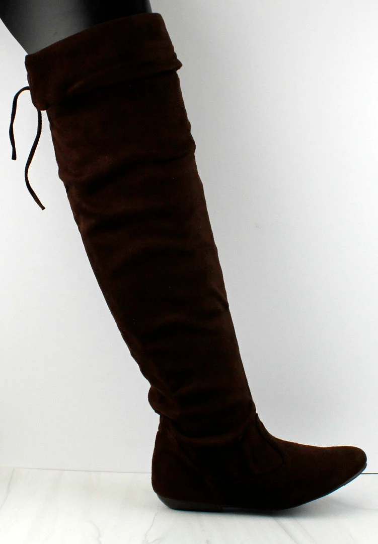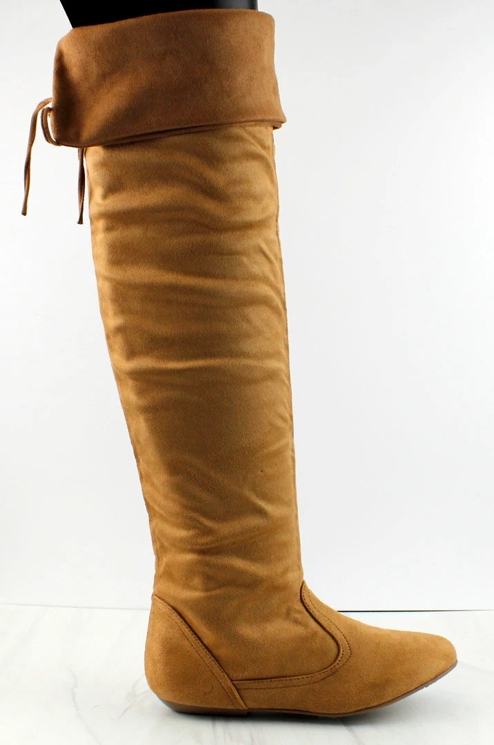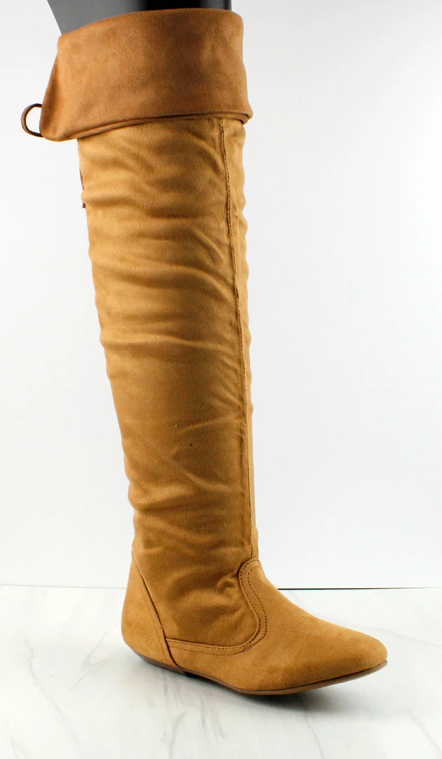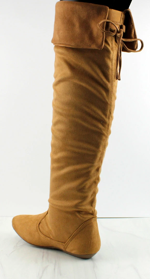 We are absolutely, positively obsessed with the flat over the knee boot! These trendy suede boots have a 26″ over-the-knee shaft and a tying collar.