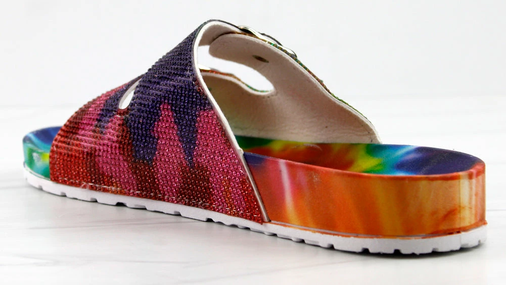 What a fun and colorful summer shoe! With a rainbow tie dye sole and multi colored rhinestones you’ll be the talk of the town with these trendy shoes!