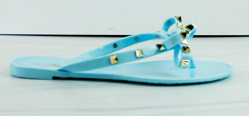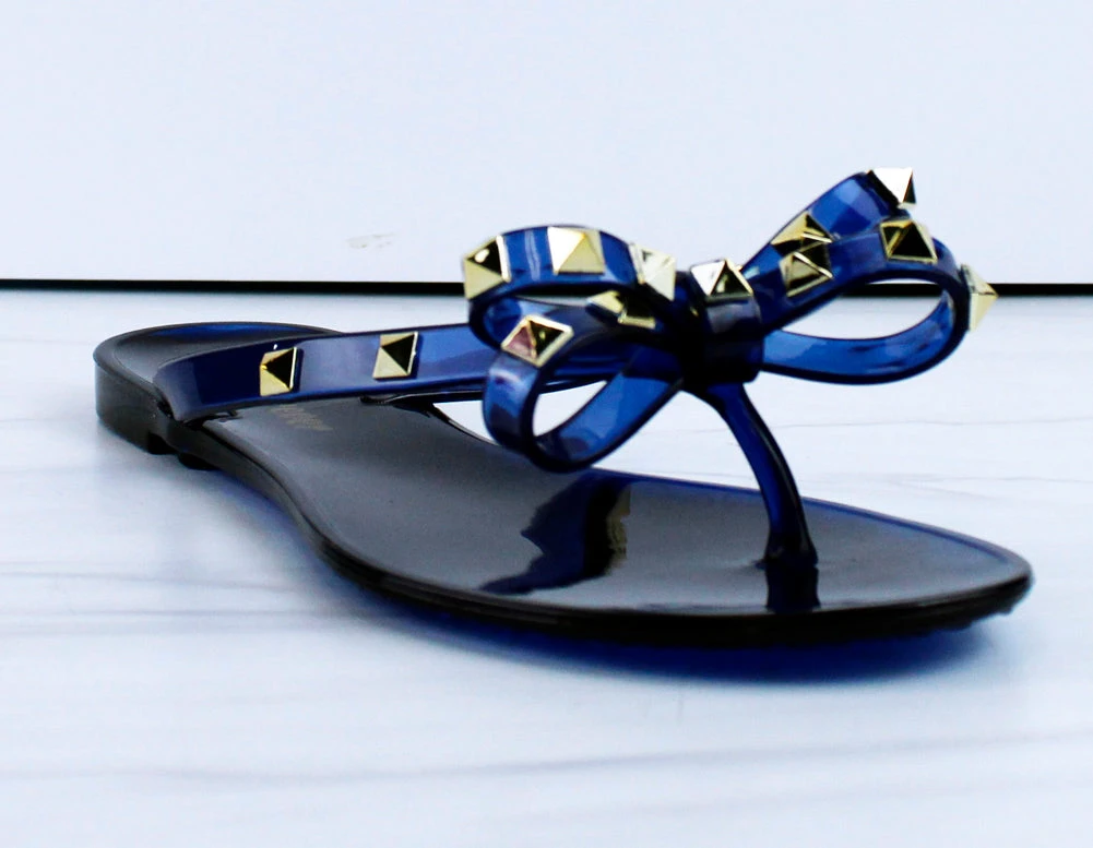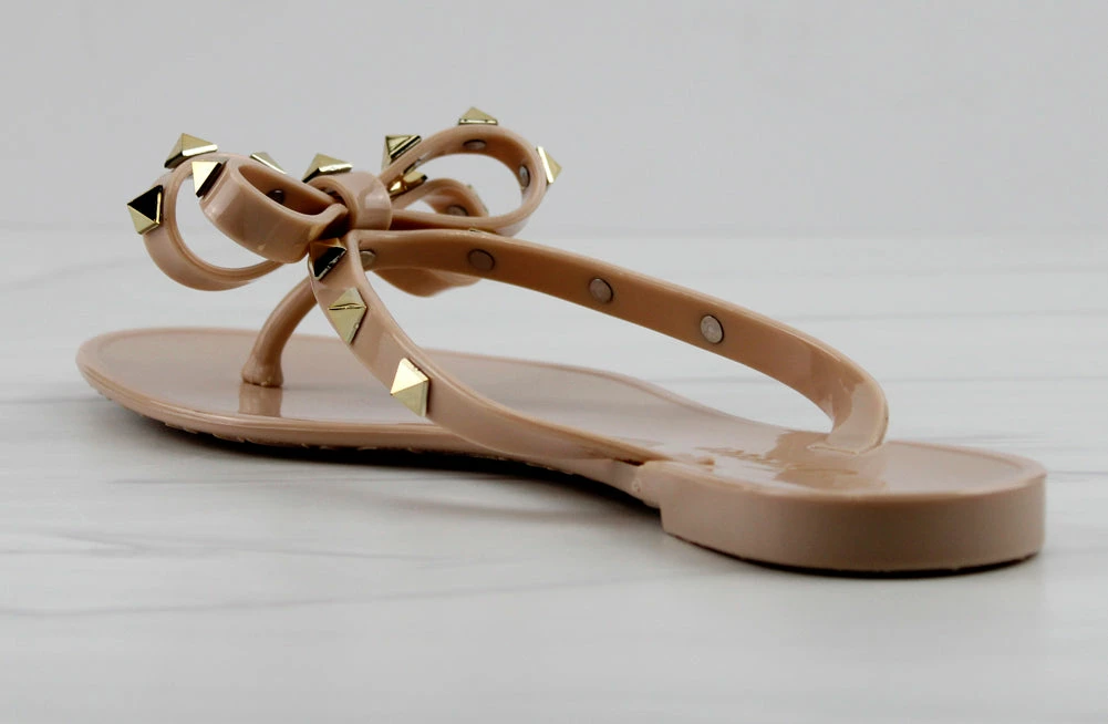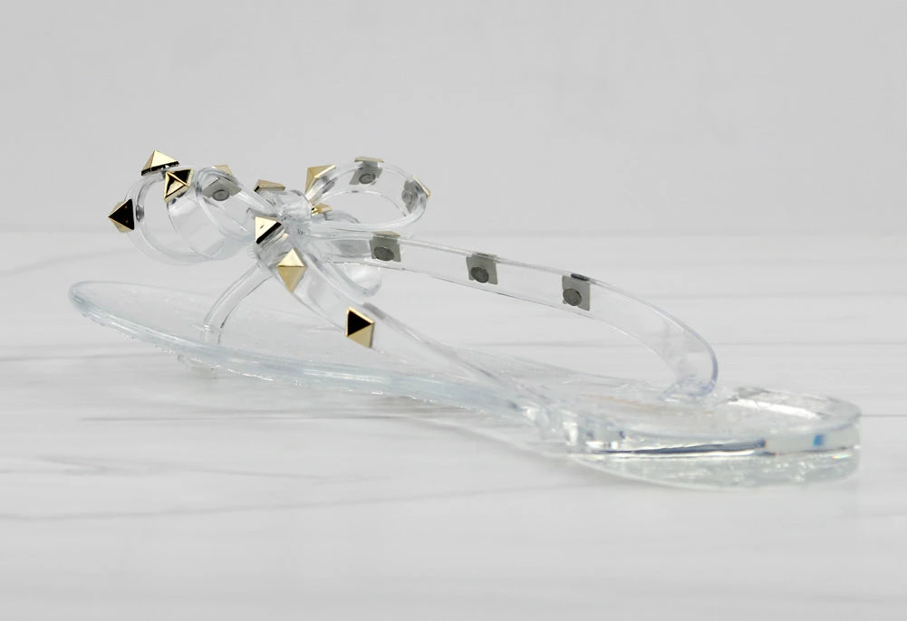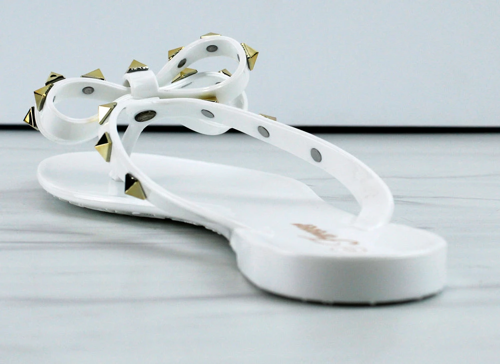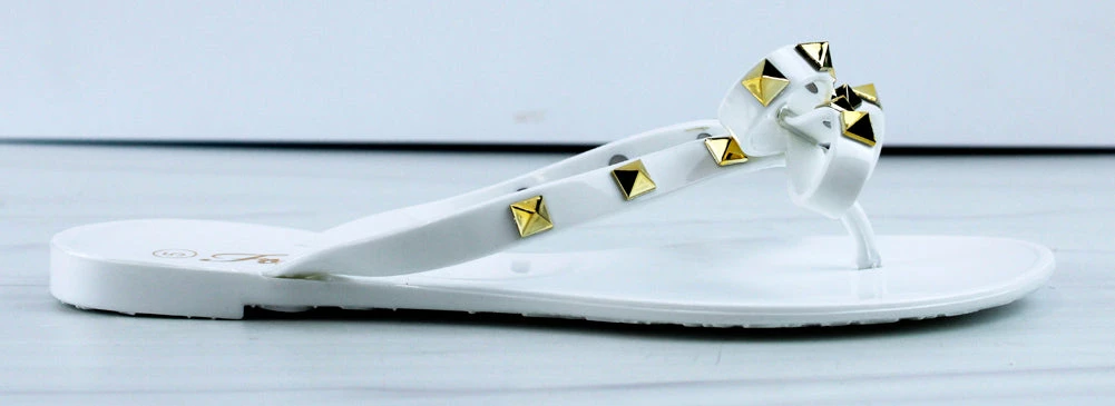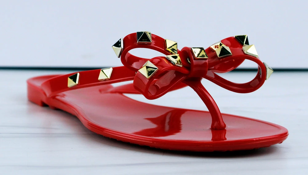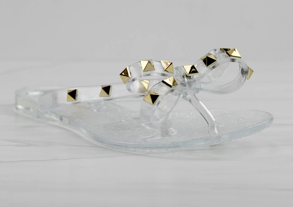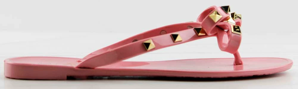 Get the look with this simple sexy thong sandal. The gold spiked bow is exactly what you need to spice up any outfit. Flexible material for comfortable wear.