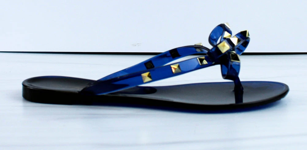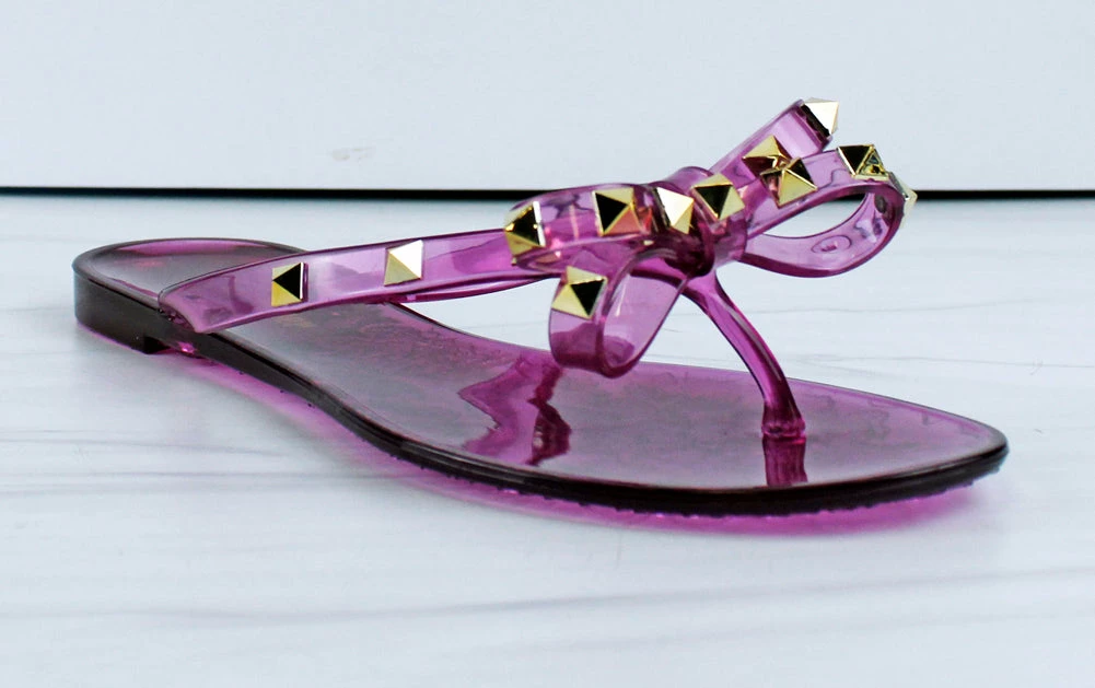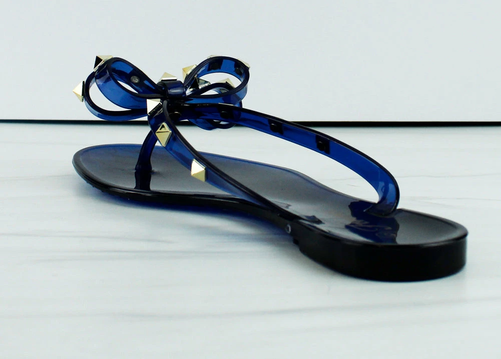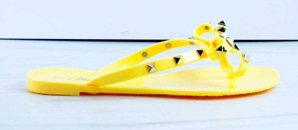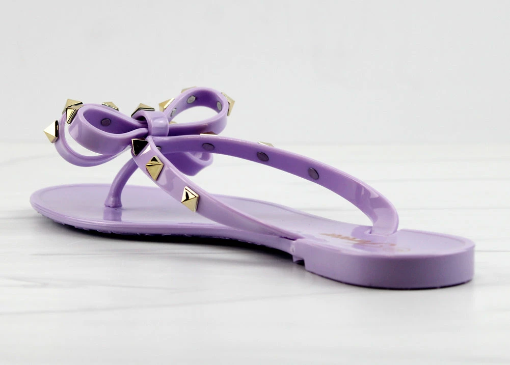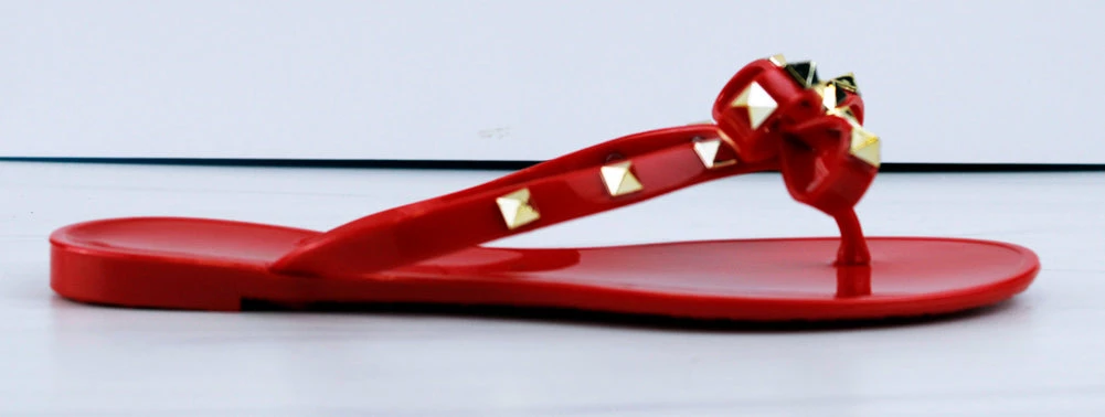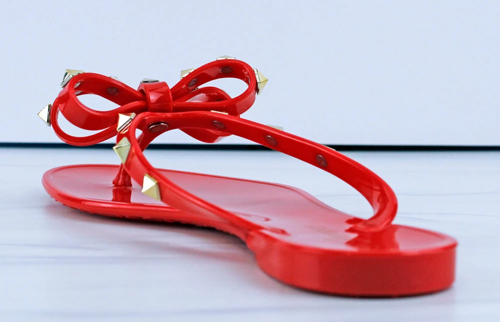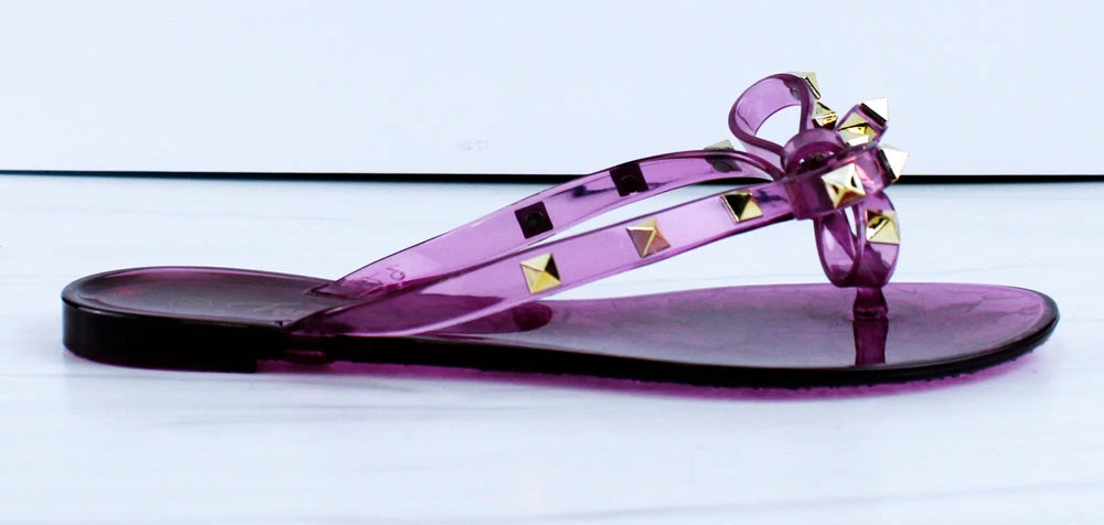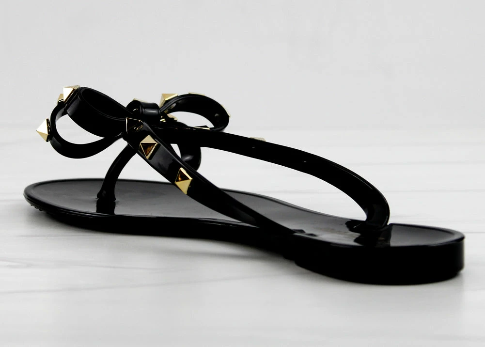 Get the look with this simple sexy thong sandal. The gold spiked bow is exactly what you need to spice up any outfit. Flexible material for comfortable wear.