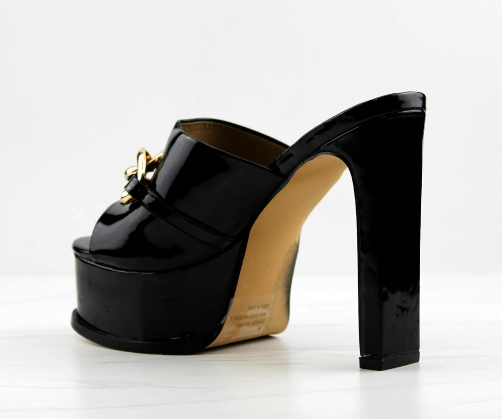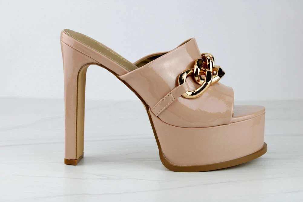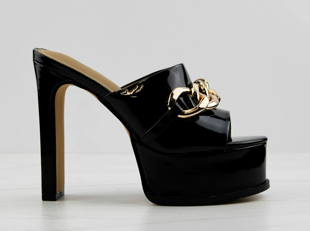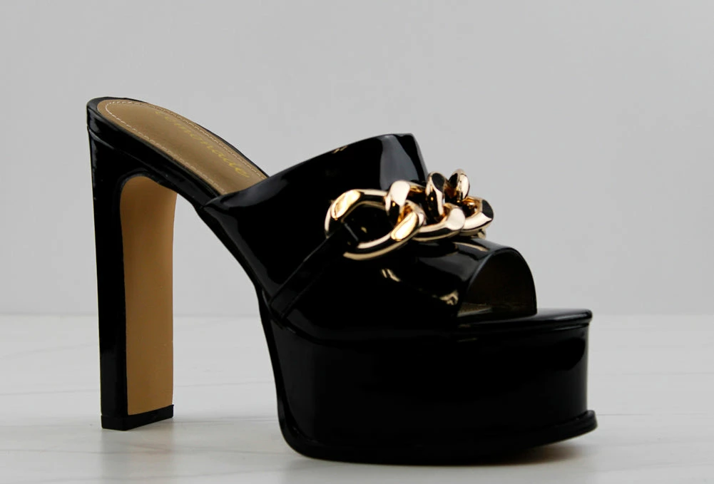 These shoes really have “no chill”!! Step out in height and style in these No Chill Platform Stiletto Heels! With a chain embellishment on the wide upper strap it adds the perfect amount of spunk!