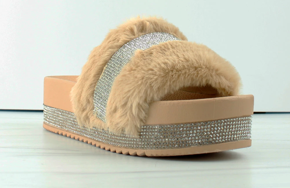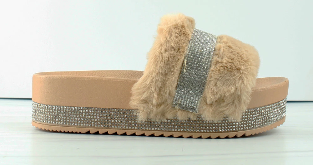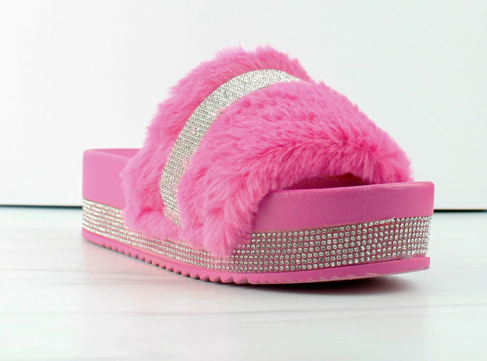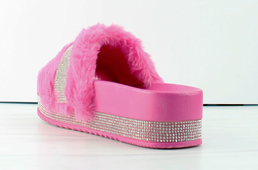 These furry slides features a soft comfy molded footbed, faux fur and rhinestone embellished wide band, thick rubber platform, threaded outsole, rhinestone crystal encrusted platform, slide in construction and lightly padded insole.