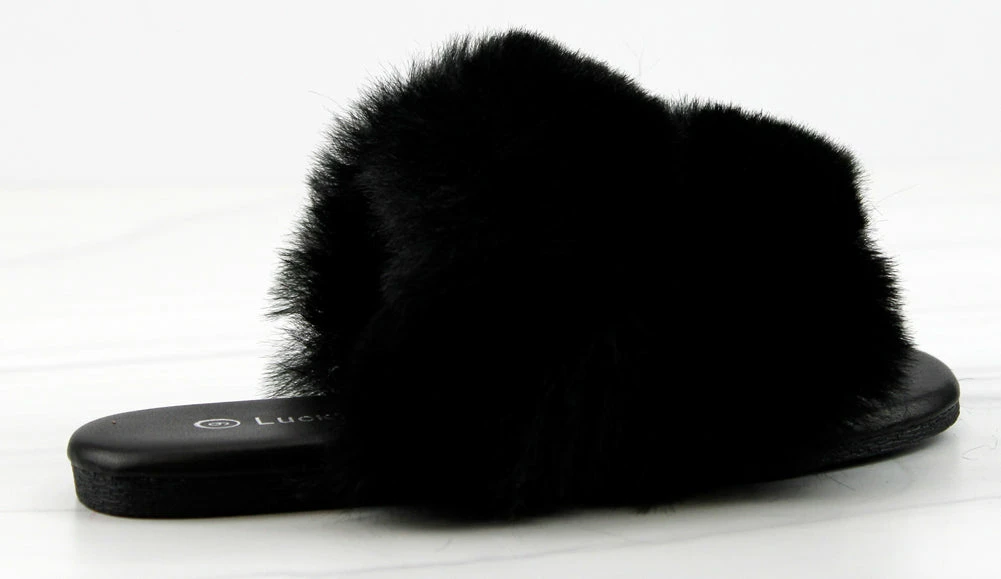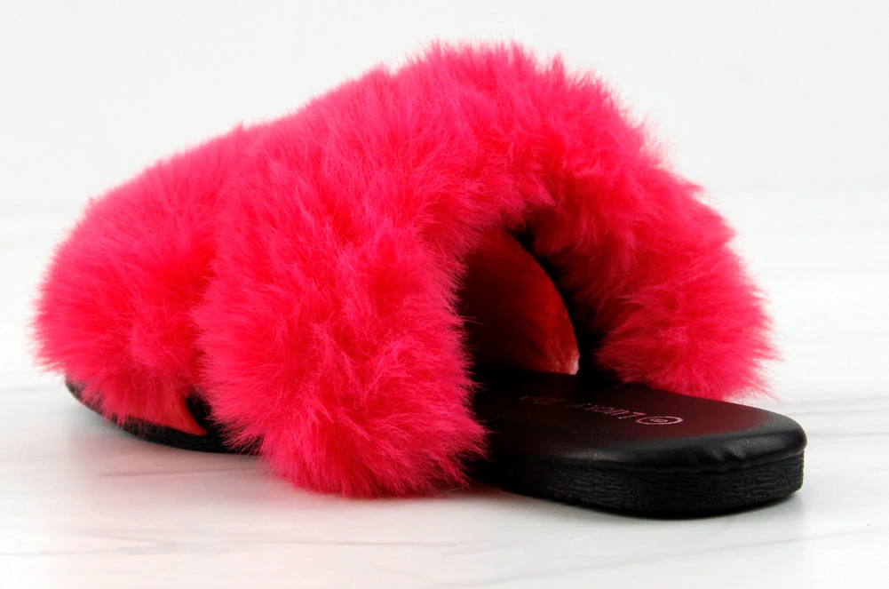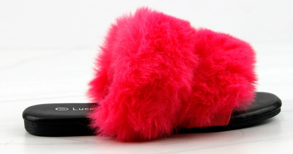Dual faux fur straps are the highlight of this playful slide sandal.