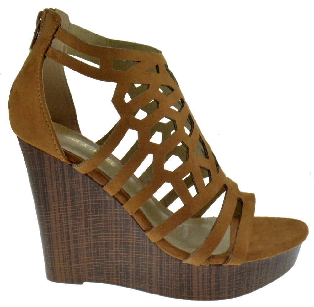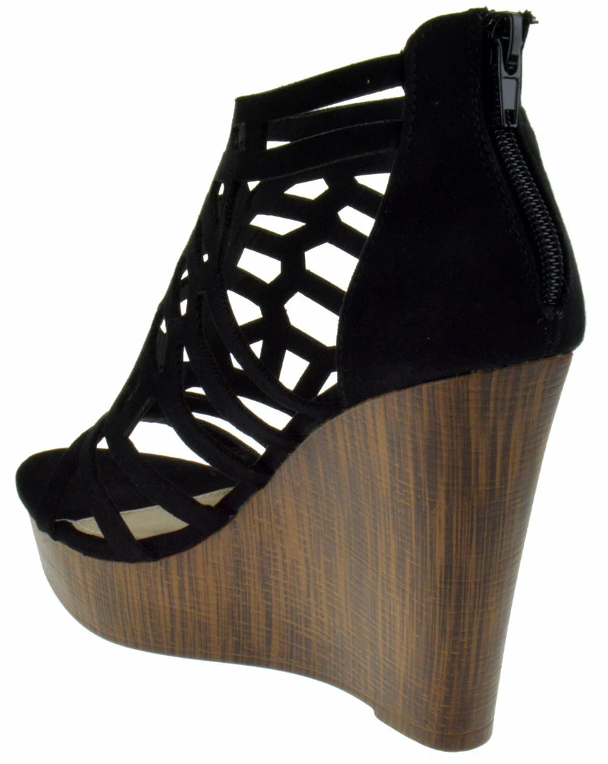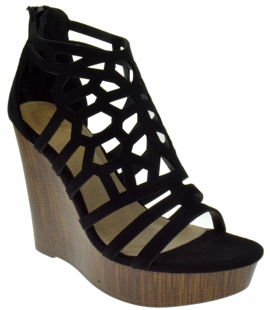 These versatile sandals are made with a faux suede upper, open toe and caged, cut out construction. Also made with a faux wooden platform wedge heel and hind zip for easy slip on and off.