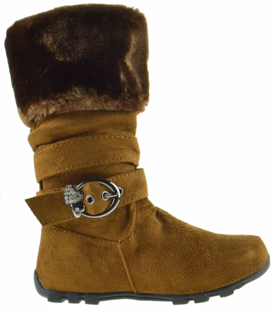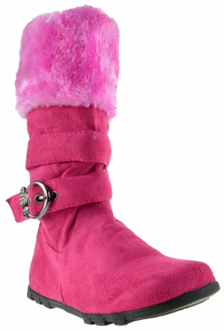 Warm and style all in one! Little girl’s fur trimmed mid calf shearling boots with a rhinestone buckle accent!
