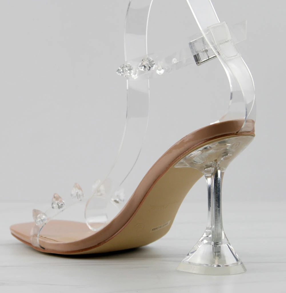 Strap pyramid heels with clear straps and nude bottom. Clear spikes are embellished around the ankle strap and across the toe strap. Any outfit can be paired with these heels.