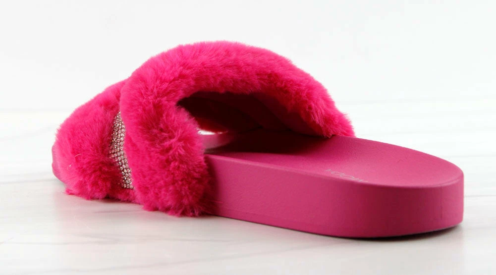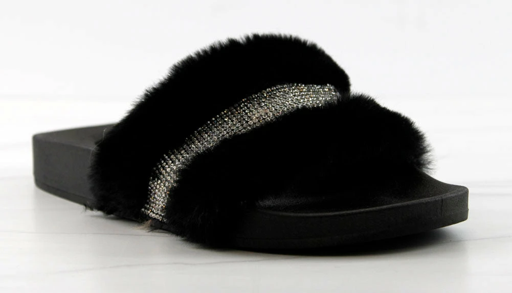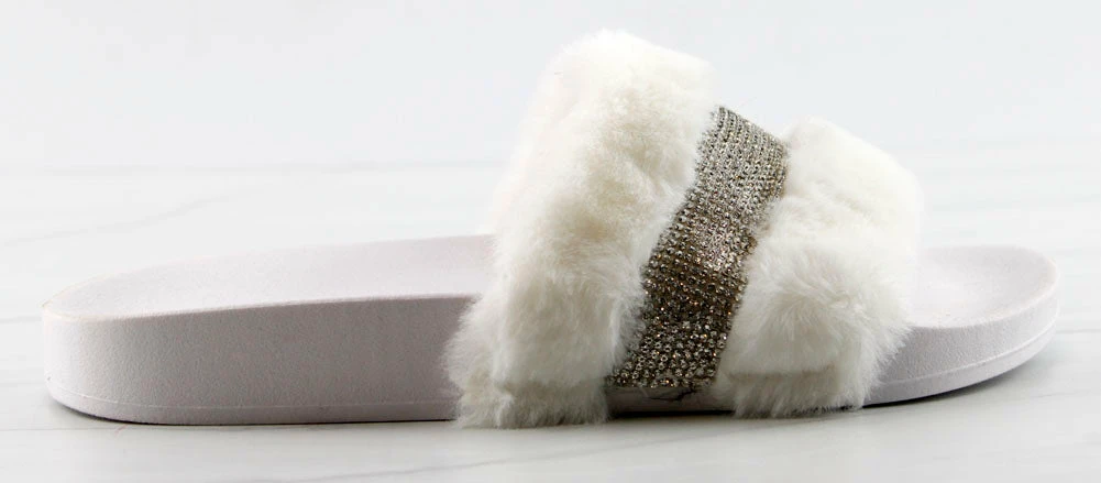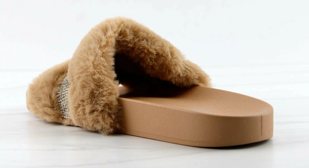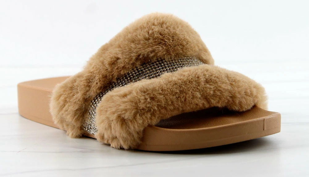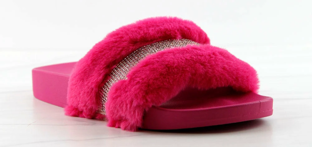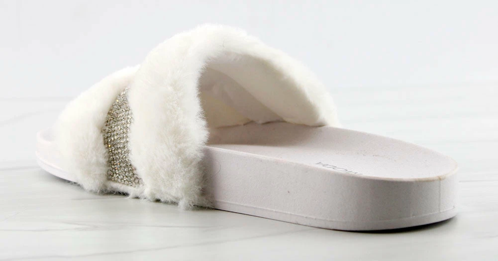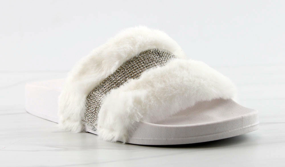 Step out in our fun and furry slides with a gorgeous rhinestone strap embellishment!