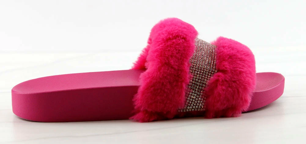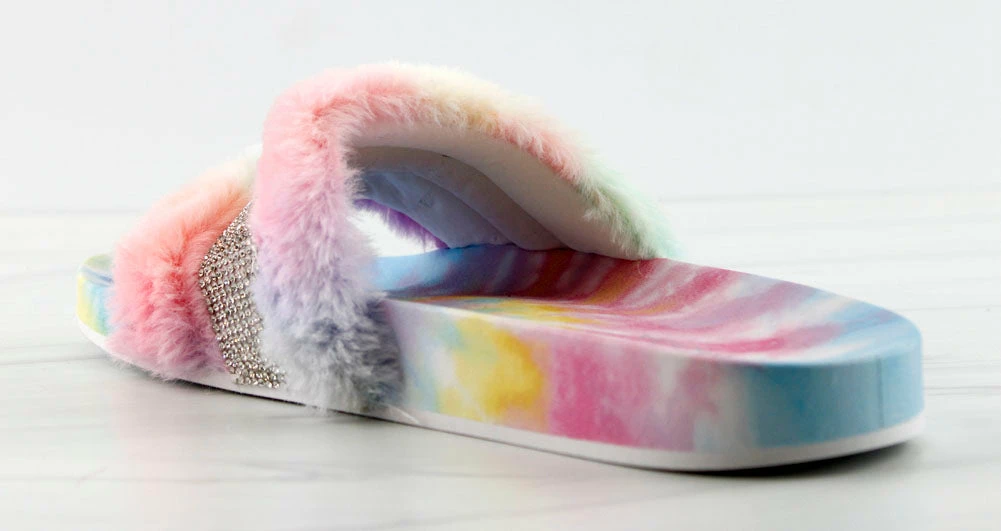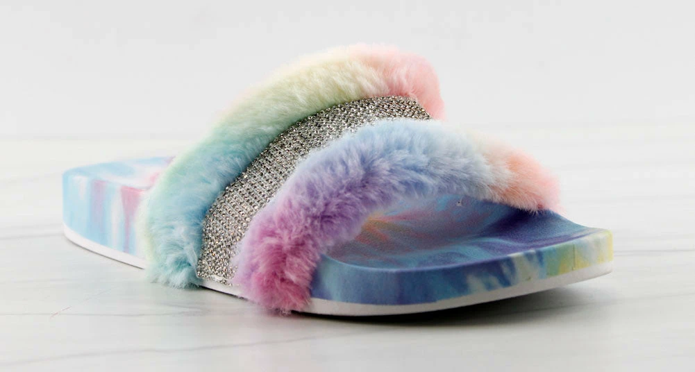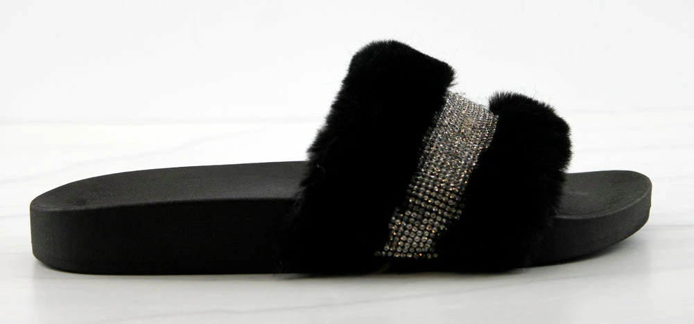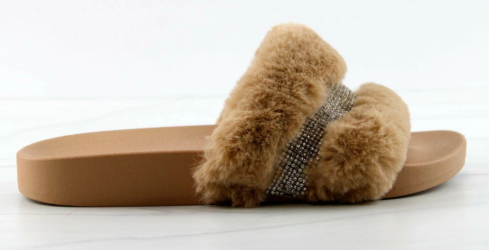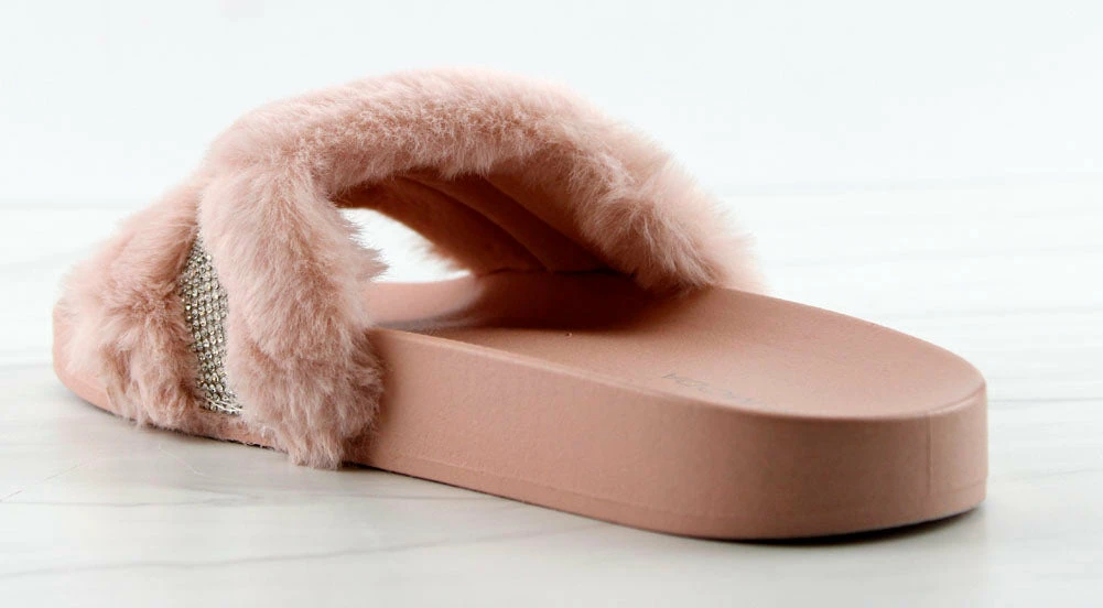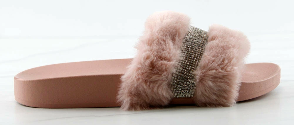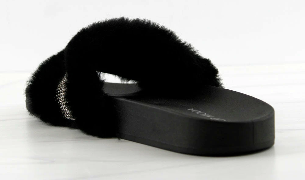 Step out in our fun and furry slides with a gorgeous rhinestone strap embellishment!