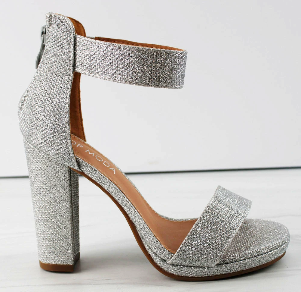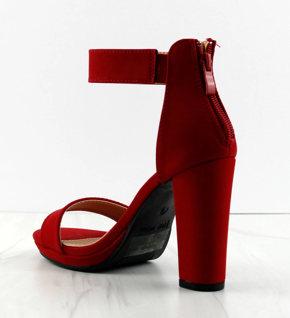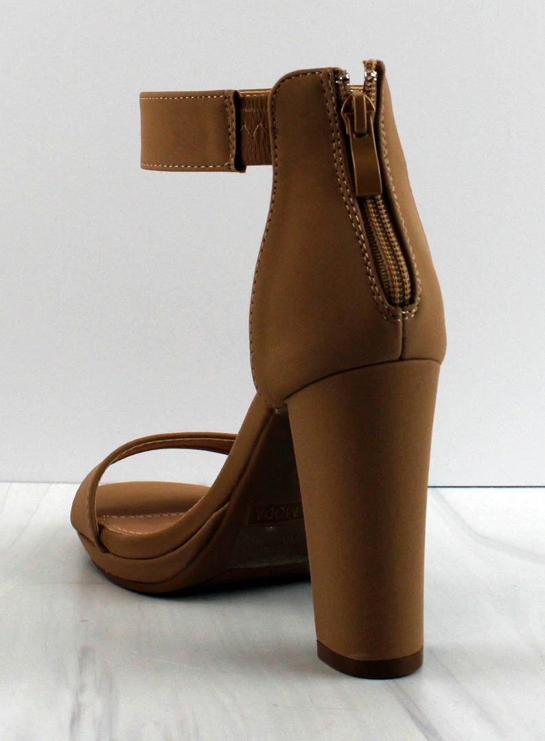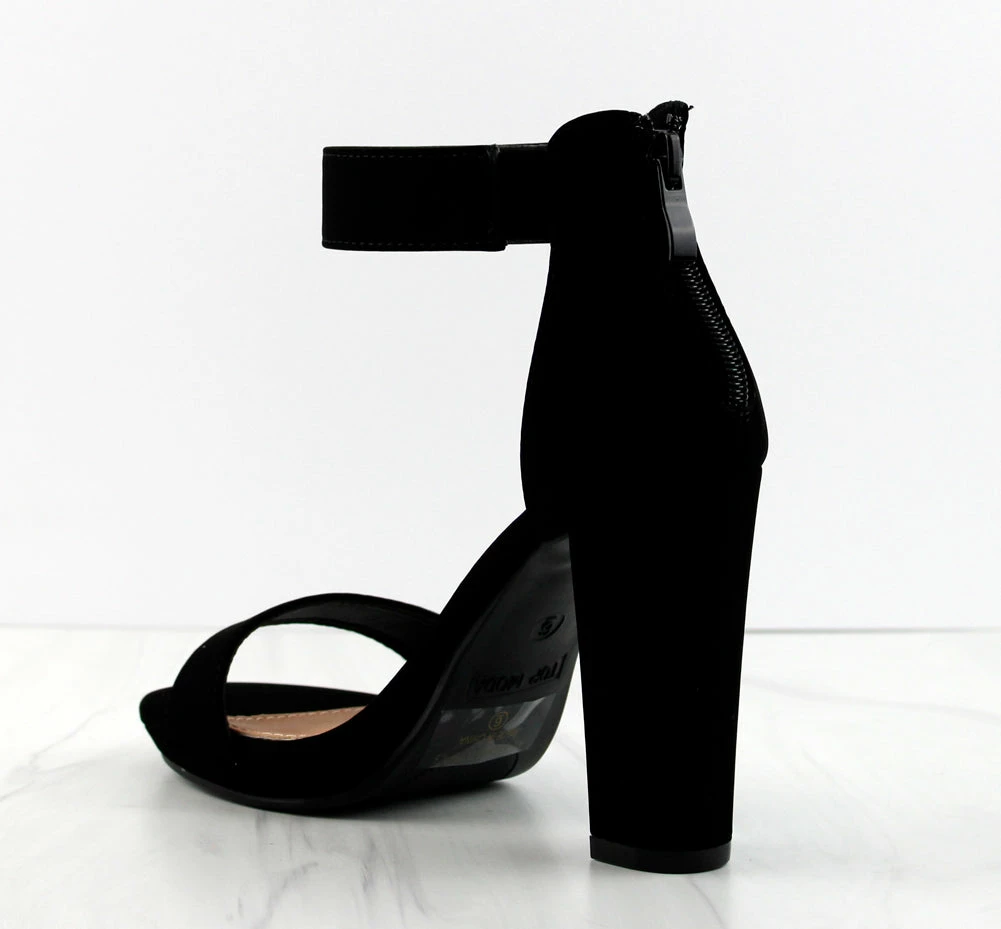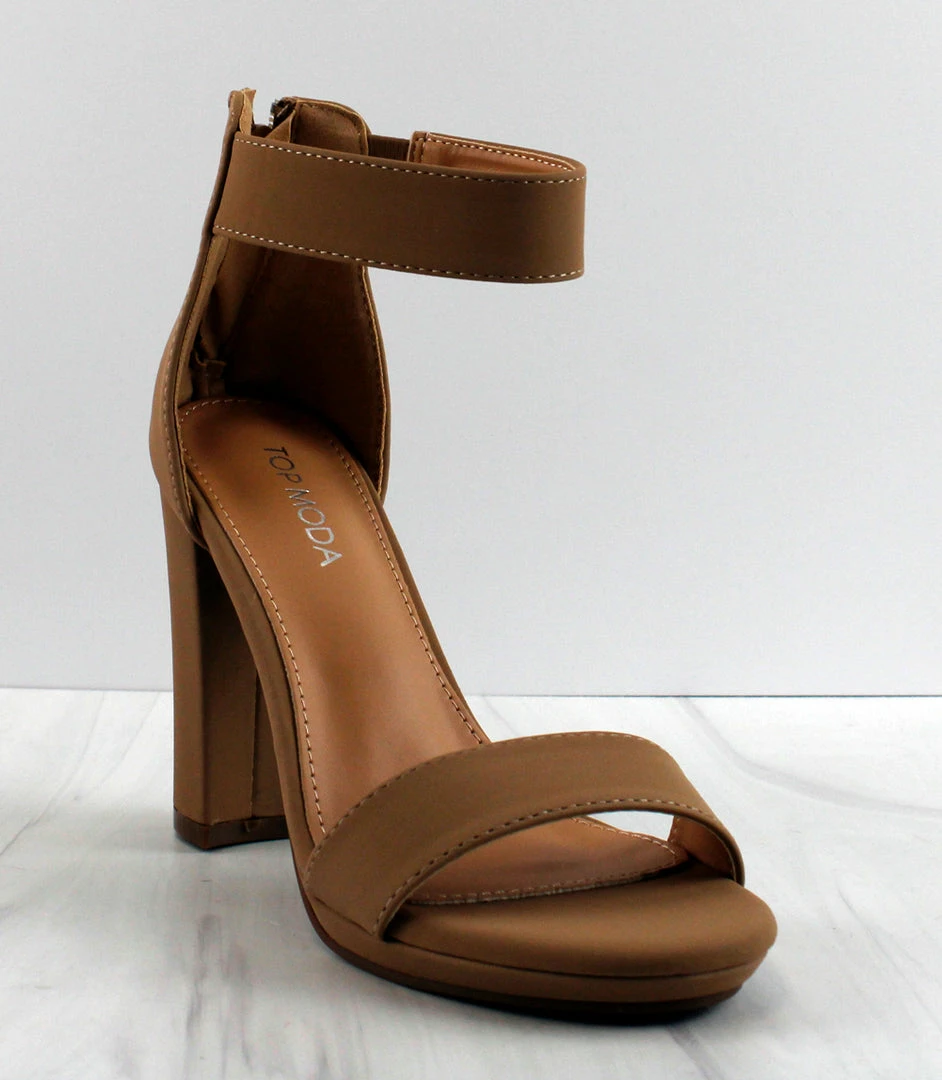 Ladies open toe, platform high heel with thick ankle strap. Back zipper close.