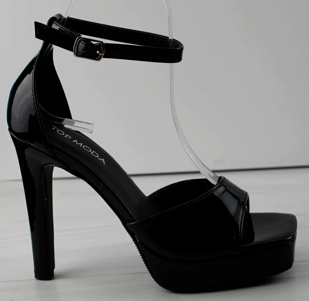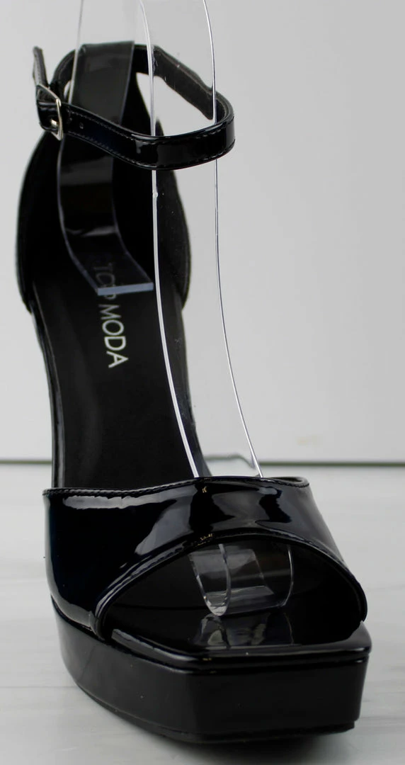 You will definitely draw attention with these gorgeous faux leather stiletto heels! They feature an open toe as well as a slight platform in the front. They also have an easy to use ankle buckle closure!