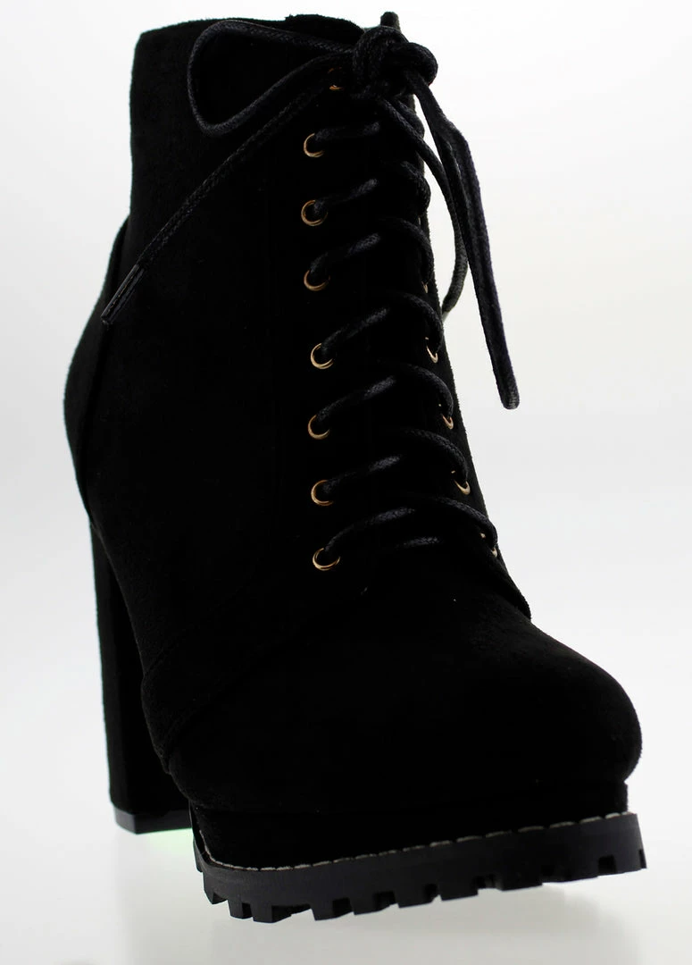 These fashionable ankle booties really make a statement. They are perfect for a dressy outfit or to dress up a simple jeans and t-shirt outfit. The inside zipper is perfect for easy slip on and off. These booties feature a lace up top for an extra pop. They have a chunky heel for extra comfort and are faux suede.