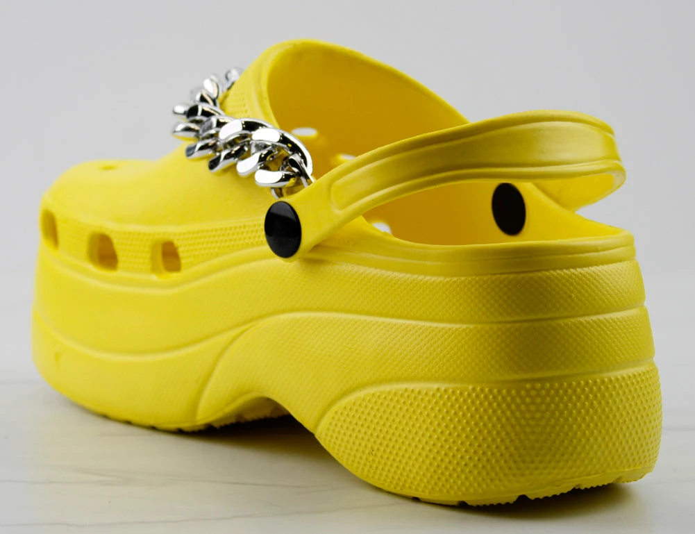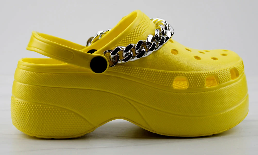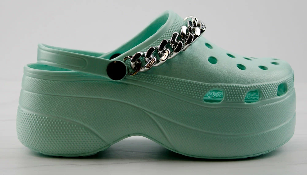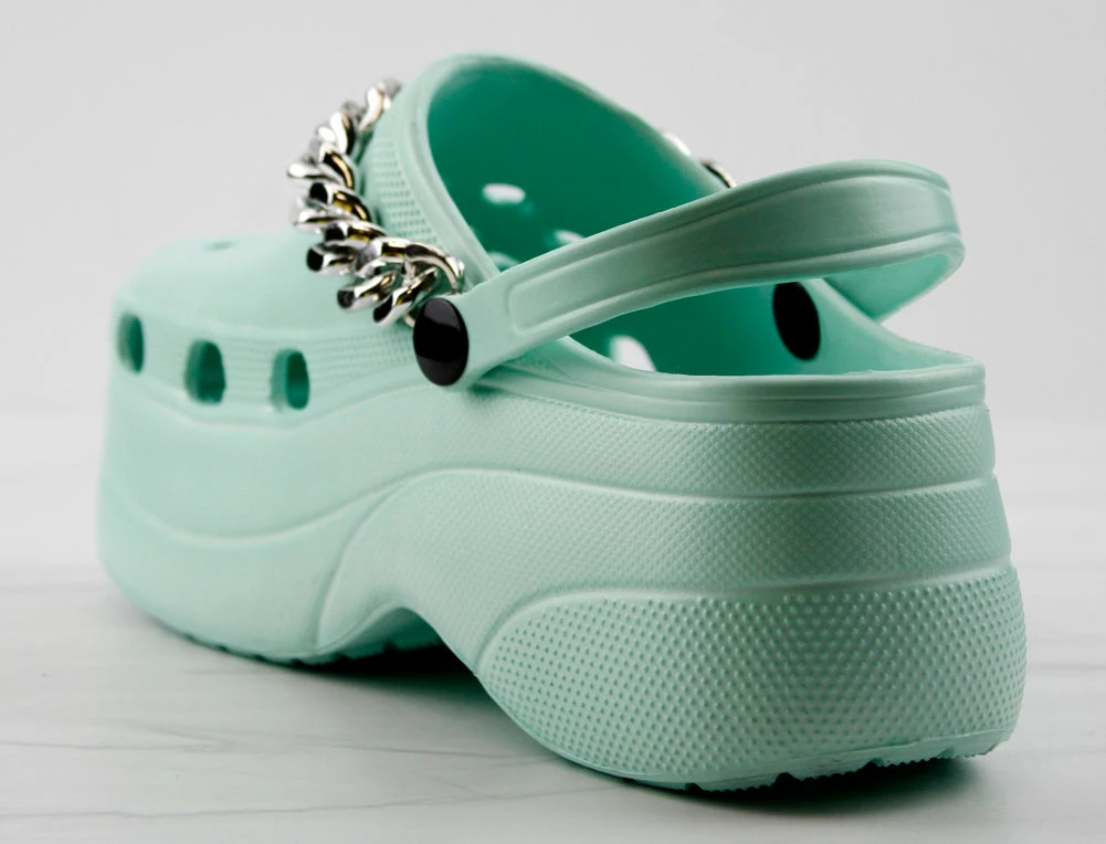 Lolli 32 is our 3 inch platform clog. Its slip resistant and super casual for summer. The sole fits the foot perfect for all day comfort. It also features a back strap to hug your heel and a metallic silver chain accent.